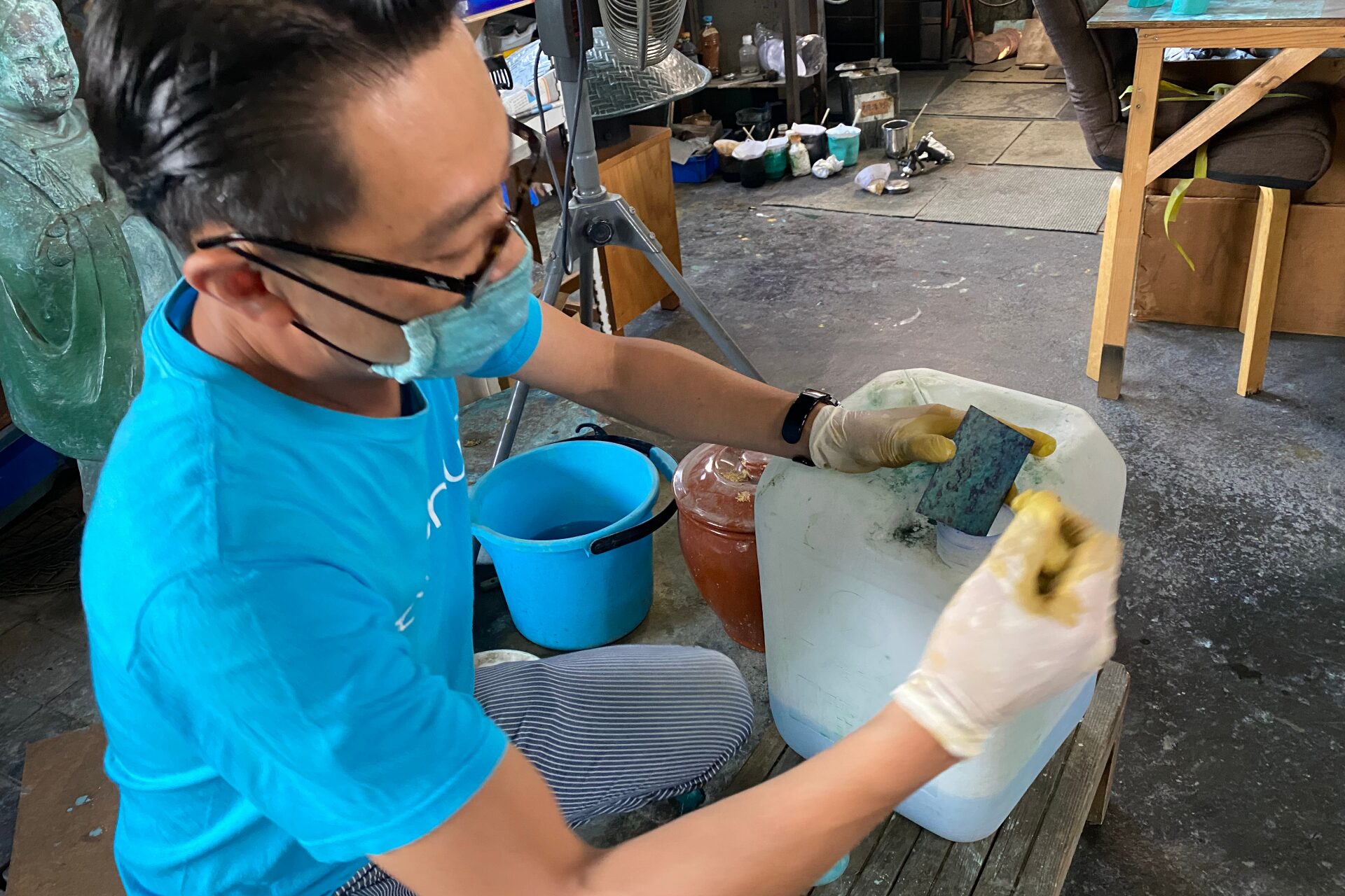 高岡市のモメンタムファクトリー・Oriiでは、銅器の着色技術を見学。