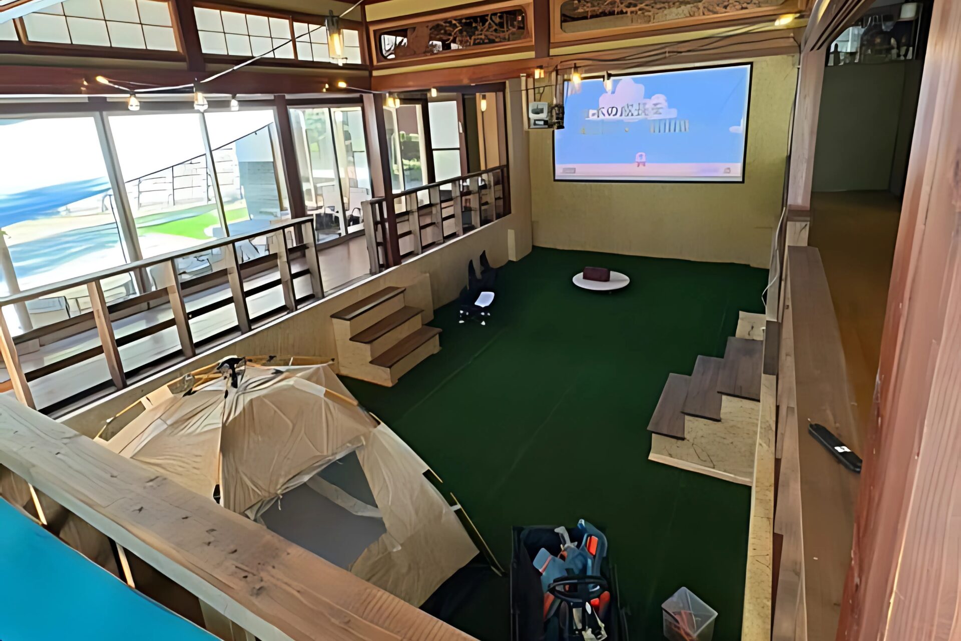 屋内外でもBBQが楽しめる設備ご用意しております。また、子供たちも楽しめる、室内キッズスペースでは、屋内キャンプ体験もできたり、120インチ大型スクリーンでゲームた映画も楽しめます。